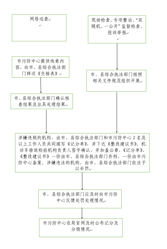 (二)记分方式。市污防中心联合市、县综合执法部门通过监督检查、网络巡查、专项检查、处理投诉举报等方式,发现并查实机动车排放检验机构存在的问题,填写《机动车排放检验机构问题线索移送交接表》及时抄送给各县区生态环境执法部门,各县区接到问题线索后组织执法人员,由污防中心配合进行现场检查核实,经核实无误的现场签字确认。对机动车排放检验机构存在违规行为的,由市污防中心和市、县综合执法部门2名及以上工作人员共同填写《南昌市机动车排放检验机构记分确认单》(以下简称《记分单》,具体见附件2)及《南昌市机动车排放检验机构整改建议书》(以下简称《整改建议书》,具体见附件3),机动车排放检验机构负责人签字确认,并加盖公章。机动车排放检验机构记分管理业务流程,详见附件4。《记分单》和《整改建议书》一式两份,一份由机动车排放检验机构存档,一份由市污防中心备案。