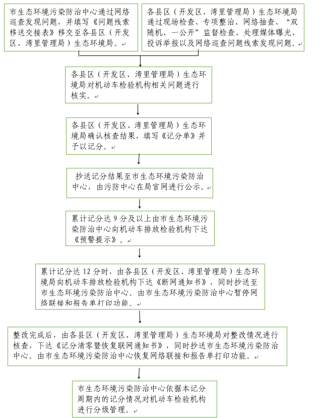 1.市生态环境污染防治中心对累计记分达9分及以上的机动车排放检验机构,下达《机动车排放检验机构断网预警提示》(见附件4),并抄送一份至各县区(开发区、湾里管理局)生态环境局。