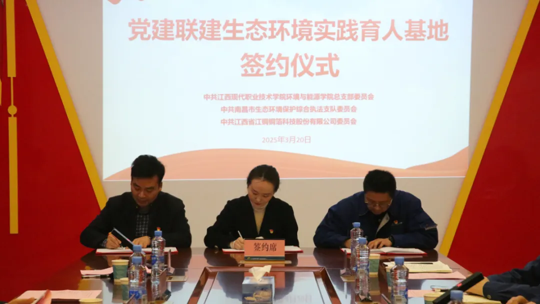 为深入学习贯彻习近平新时代中国特色社会主义思想,努力构建资源共享、优势互补、互相促进、共同提高的党建工作新格局。3月20日上午,南昌市生态环境保护综合执法支队、江西现代职业技术学院、江铜铜箔科技股份有限公司三方党建联建生态环境实践育人活动启动仪式在江铜铜箔科技股份有限公司研发中心举行。南昌市生态环境局党组成员、副局长、机关党委书记刘扬,江西现代职业技术学院党委书记陈飞,江铜集团党委组织部部长刘智慧,江铜铜箔科技股份有限公司党委书记、董事长吴晓光等出席活动。