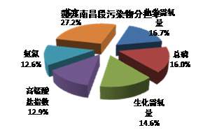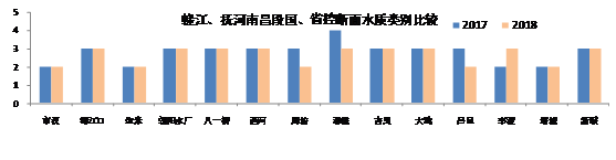 赣江南昌段水质优,100%的断面达到ⅱ—ⅲ类标准,各断面水质类别均达到规划水质目标要求。其中干流、主支、中支、北支和南支水质优良(均为ⅱ—ⅲ类);赣江南昌入九江交界断面水质优(ⅱ类),赣江中支入鄱阳湖断面水质优(ⅱ类)、北支、南支入鄱阳湖断面水质良(ⅲ类)。抚河南昌段主支塔城断面水质优(ⅱ类),干流李渡断面、西支入鄱阳湖(新联)断面水质良(ⅲ类)。县区交界断面90%达到ⅱ—ⅲ类标准。赣江南昌段污染分担率较高的指标为化学需氧量、总磷、生化需氧量、高锰酸盐指数、氨氮,抚河南昌段污染分担率较高的指标为总磷、化学需氧量、生化需氧量、高锰酸盐指数、氨氮。与2017年比较,赣江南昌段水质总体稳定,抚河南昌段1个断面水质下降。