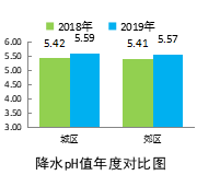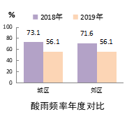 2019年,我市城区、郊区降水ph值分别为5.59和5.57,酸雨频率均为56.1%,均为轻酸性,无中酸雨和重酸雨。与上年相比,全市酸雨情况有所好转。城区、郊区降水酸度分别下降3.1%和3.0%,酸雨频率分别下降17.0个百分点和15.5个百分点。未出现中酸雨和重酸雨,非酸雨占比明显提高。