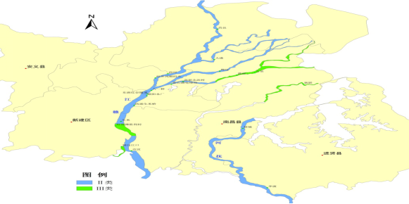 2019年,赣江南昌段共有17个断面,水质为优。ⅰ~ⅲ类水质断面比例为100%,其中,ⅱ类占76.5%,ⅲ类占23.5%。市汊、生米、西湖生米桥、朝阳水厂、东湖红谷隧道、八一桥、经开风顺码头、西河、青山湖电排站、高新北沥村、周坊、大港、昌邑断面均为ⅱ类,水质状况优;锦江江口、红谷滩胜利村、滁槎、吉里断面均为ⅲ类,水质状况良好。赣江南昌段与九江交界断面——昌邑断面水质优,中支入鄱阳湖周坊断面水质为优,北支入鄱阳湖大港断面水质为优,南支入鄱阳湖吉里断面水质良好。2019年与上年相比,赣江南昌段17个断面ⅰ~ⅲ类水质比例均为100%,水质状况为优,其中ⅱ类断面(76.5%)较上年上升35.3个百分点,ⅲ类断面(23.5%)较上年下降35.3个百分点。河流水质指数为3.81,比上年(4.23)下降9.9%,有15个断面河流水质指数下降,2个断面河流水质指数有所上升。其中,市汊、锦江江口、红谷滩胜利村、生米、西湖生米桥、东湖红谷隧道、经开风顺码头、西河、青山湖电排站、高新北沥村、滁槎、吉里、周坊、大港、昌邑断面水质好于上年,朝阳水厂、八一桥断面水质比上年略有下降。