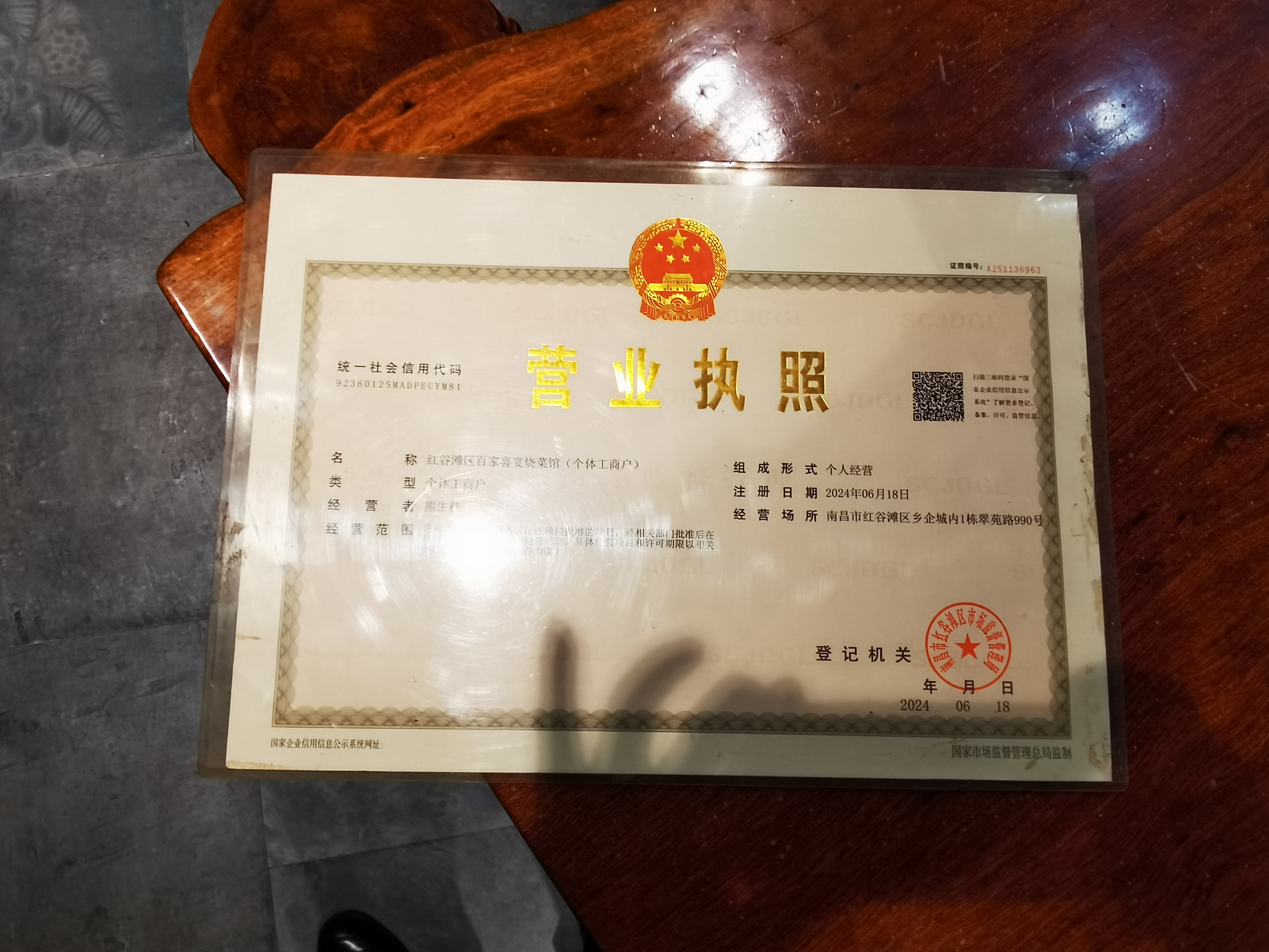 红谷滩区百家喜宴烧菜馆(即为投诉人所说的“双喜家宴”),位于红谷滩区乡企城内1栋翠花路990号。